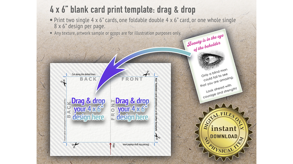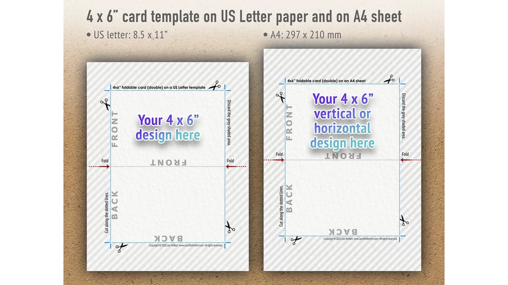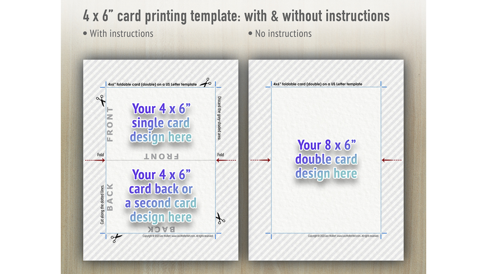 β Print two 4x6β flat cards (single), one foldable 4x6β card (double), or one single whole 8x6β design per sheet of paper with this 4x6 template.