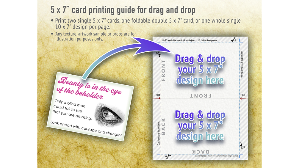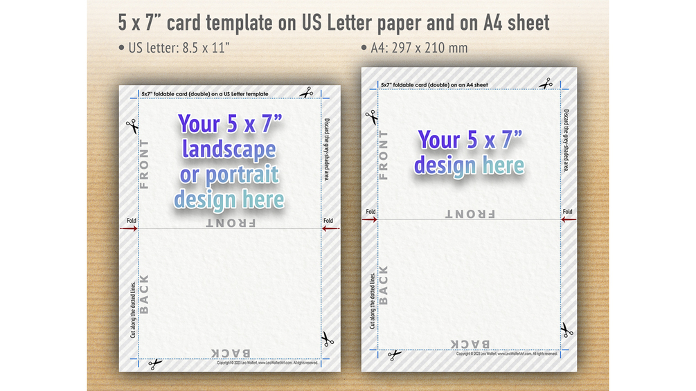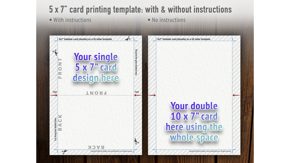 β Print two 5x7β flat cards (single), one foldable 5x7β card (double), or one single whole 10x7β design per sheet of paper with this 5x7 card template.