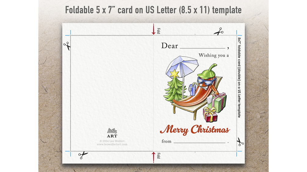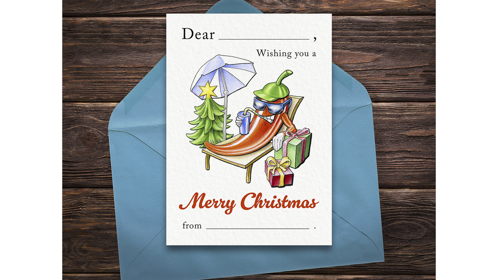 Send love and warming wishes with this funny Merry Christmas greetingcard. Let the cute chili character celebrate chilling out, rather than feeling chilly. The easy to fill out jolly Xmas post card is instantly available as a digital download. The templates print in sizes 4x6 and 5x7, both on US Letter and A4. My hand-drawn design makes a printable party present for a spicy Christmas in December or July.