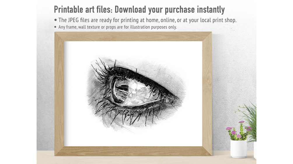 Printable wall art: Graphite pencil drawing of a beautiful woman’s eye. Instant download.